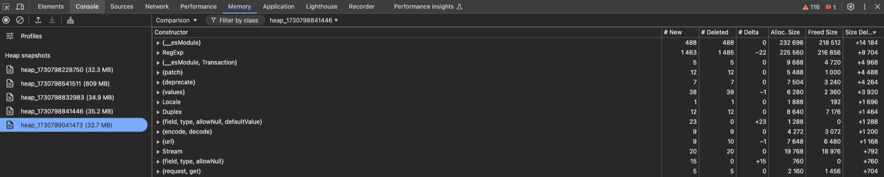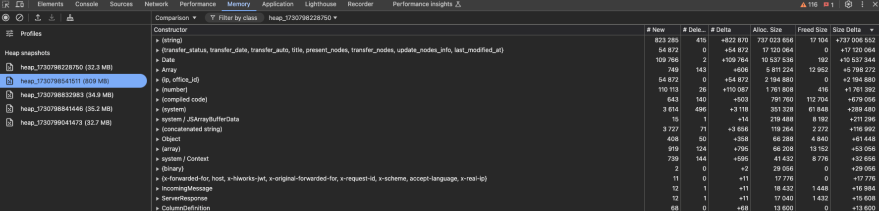 Heap Snapshot을 비교하여 어떤 객체가 메모리를 과도하게 사용하는지 확인합니다. 예를 들어, 다음과 같이 OOM 발생 전후의 메모리 사용량을 비교할 수 있습니다.