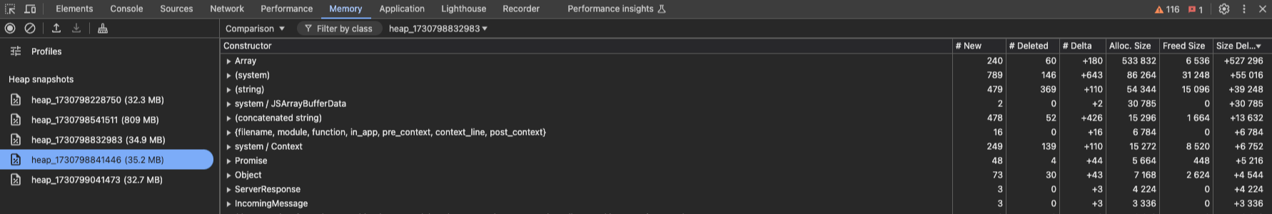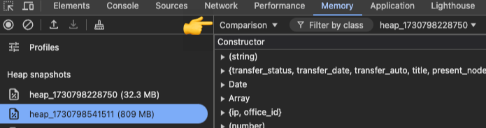 두 snapshot을 비교하면 특정 객체(Array)의 메모리 사용량이 급격히 증가한 것을 확인할 수 있습니다.