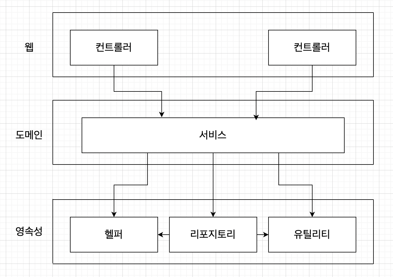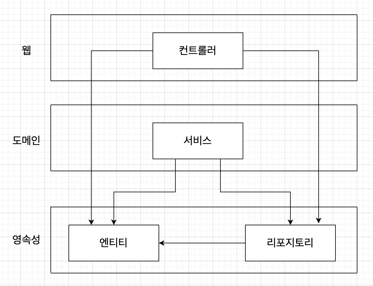 맨 위의 웹 계층은 요청을 받아 도메인 혹은 비즈니스 계층에 있는 서비스로 요청을 보낸다.
