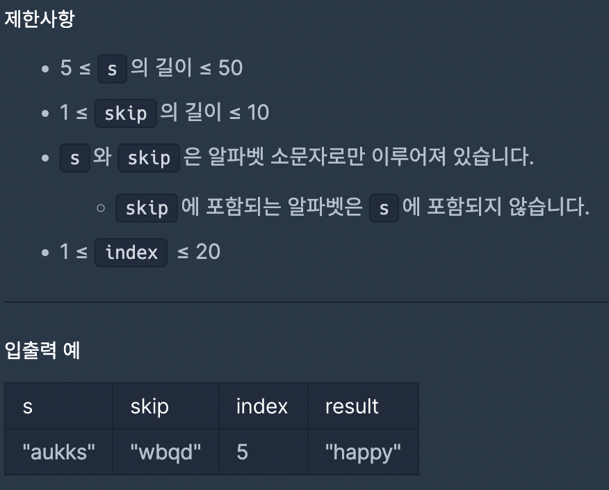 주어진 문자열 s의 각 알파벳을 주어진 index 값만큼 뒤의 알파벳으로 변환하되 skip에 있는 알파벳은 제외하고 건너뛰어야 합니다.