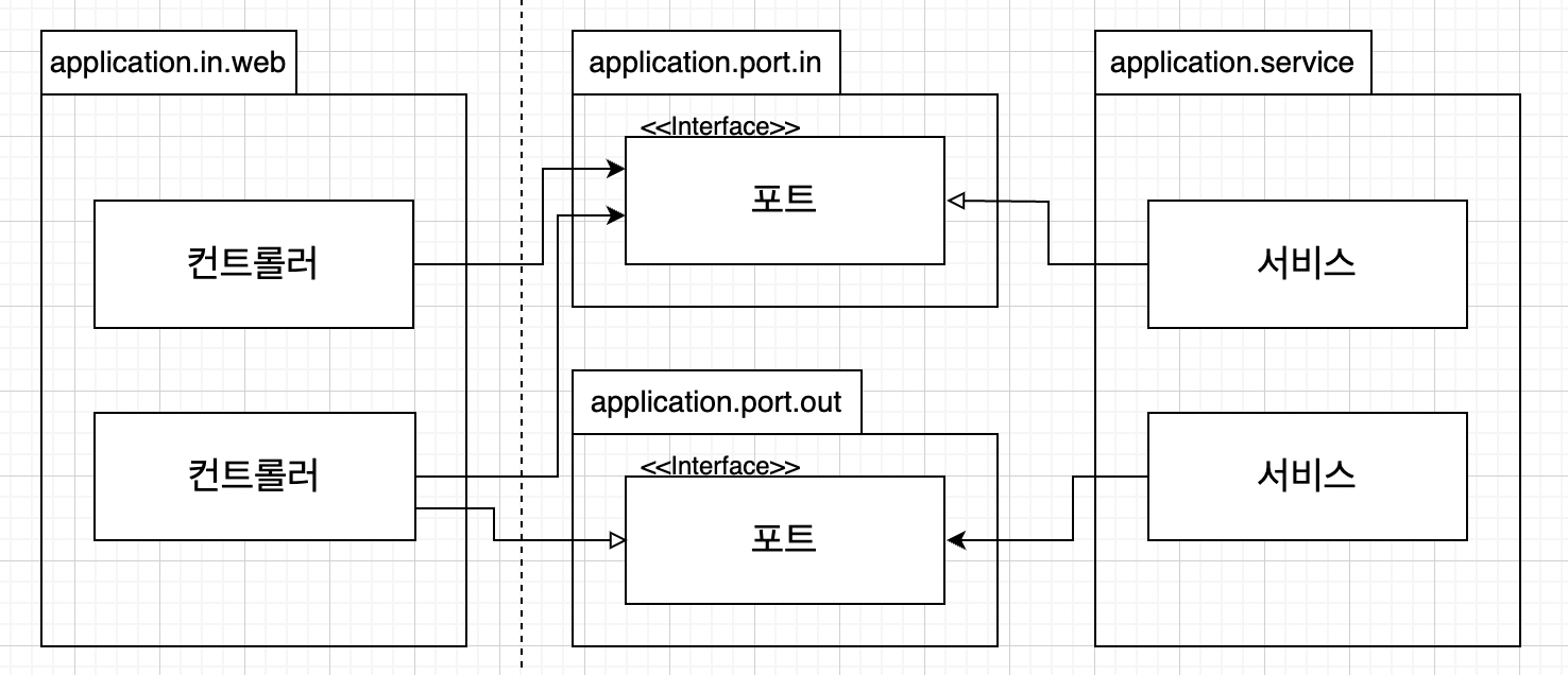 애플리케이션 계층은 웹 어댑터가 통신할 수 있는 특정 포트를 제공한다. 서비스는 이 포트를 구현하고, 웹 어댑터는 이 포트를 호출할 수 있다.