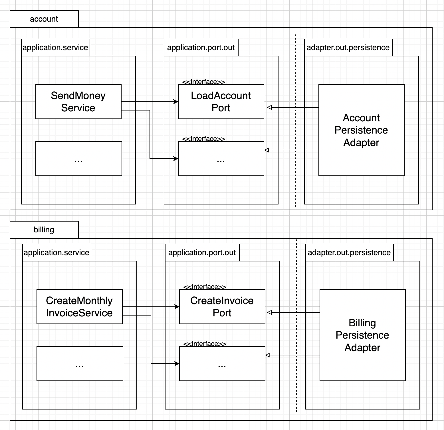 각 바운디드 컨텍스트는 영속성 어댑터를 하나씩(앞에서 설명했듯이 하나 이상일 수도 있다) 가지고 있다. '바운디드 콘텍스트'라는 표현은 경계를 암시한다. account 맥락의 서비스가 billing 맥락의 영속성 어댑터에 접근하지 않고, 반대로 billing의 서비스도 account의 영속성 어댑터에 접근하지 않는다는 의미다. 어떤 맥락이 다른 맥락에 있는 무엇인가를 필요로 한다면 전용 인커밍 포트를 통해 접근해야 한다.