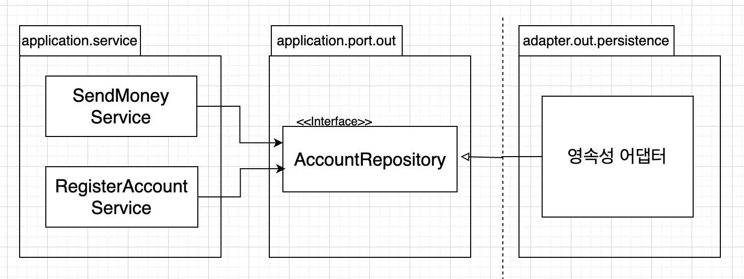 아래의 그림은 영속성 어댑터가 애플리케이션 서비스에 영속성 기능을 제공하기 위해 어떻게 의존성 역전 원칙을 적용할 수 있을지 보여준다.