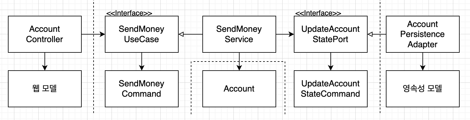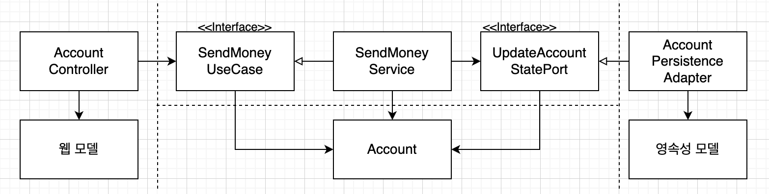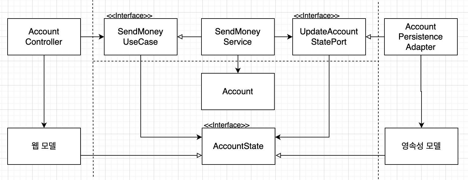 웹 계층에서는 웹 컨트롤러가 SendMoneyUseCase 인터페이스를 호출해서 유스케이스를 실행한다. 이 인터페이스는 Account 객체를 인자로 가진다. 즉, 웹 계층과 애플리케이션 계층 모두 Account 클래스에 접근해야 한다는 것(두 계층이 같은 모델을 사용)을 의미한다.