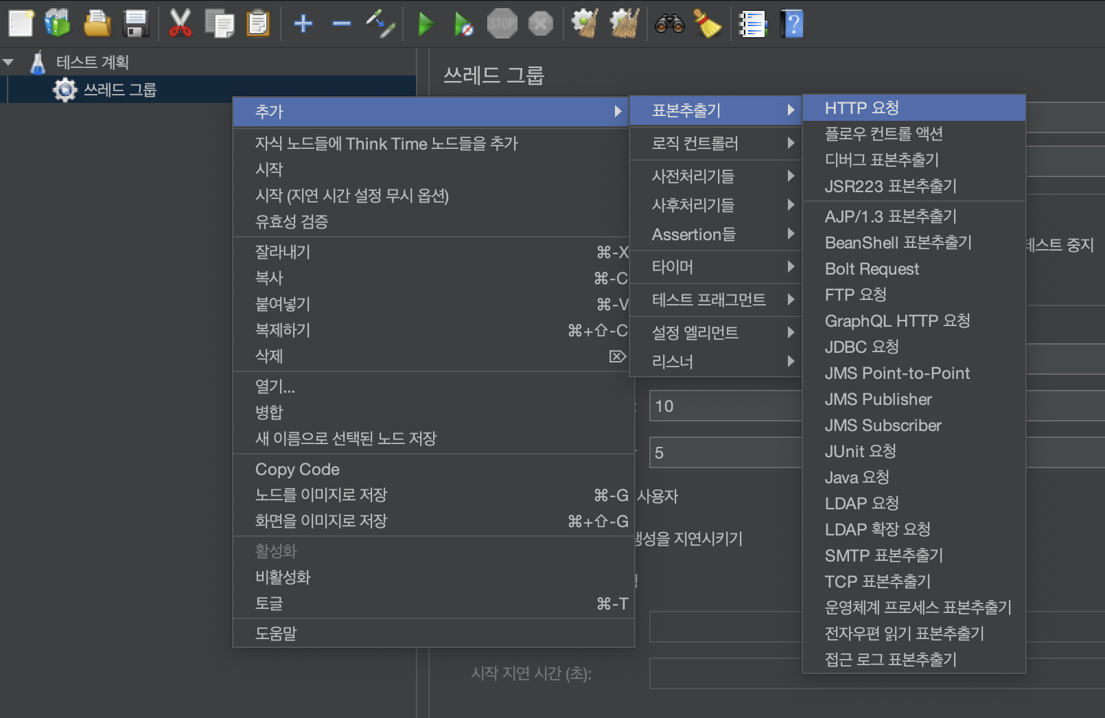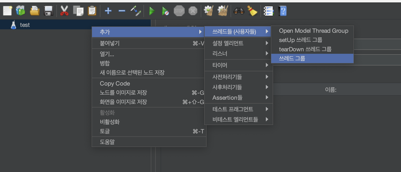 - 좌측 트리에서 Test Plan → Add → Threads (Users) → Thread Group 클릭