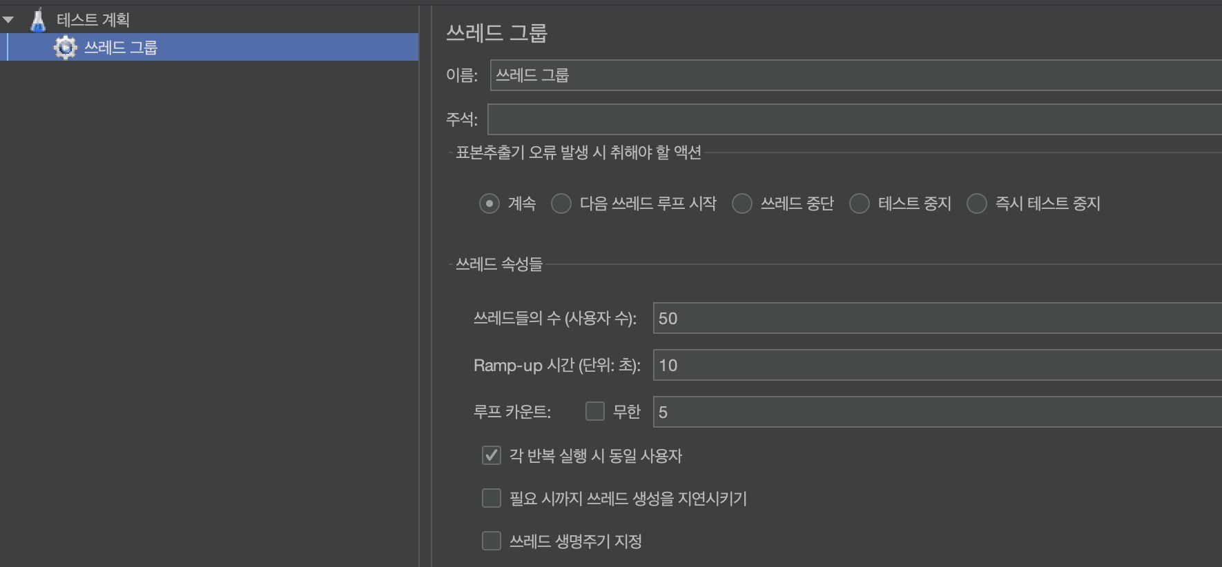 | Ramp-up period (seconds) | 사용자를 몇 초에 걸쳐 늘릴지 | 10 |