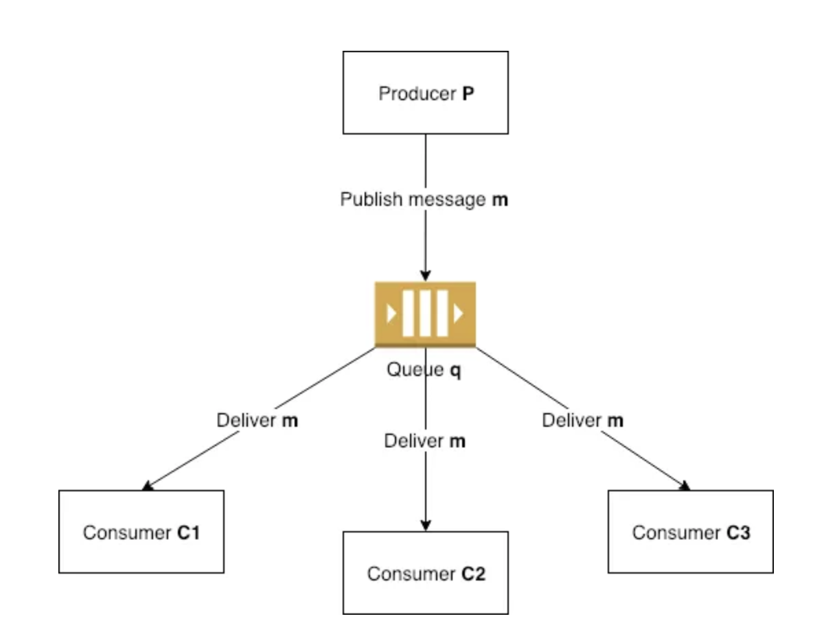 - 메시지를 큐에 넣고 한 Consumer가 처리(워크 큐 모델).