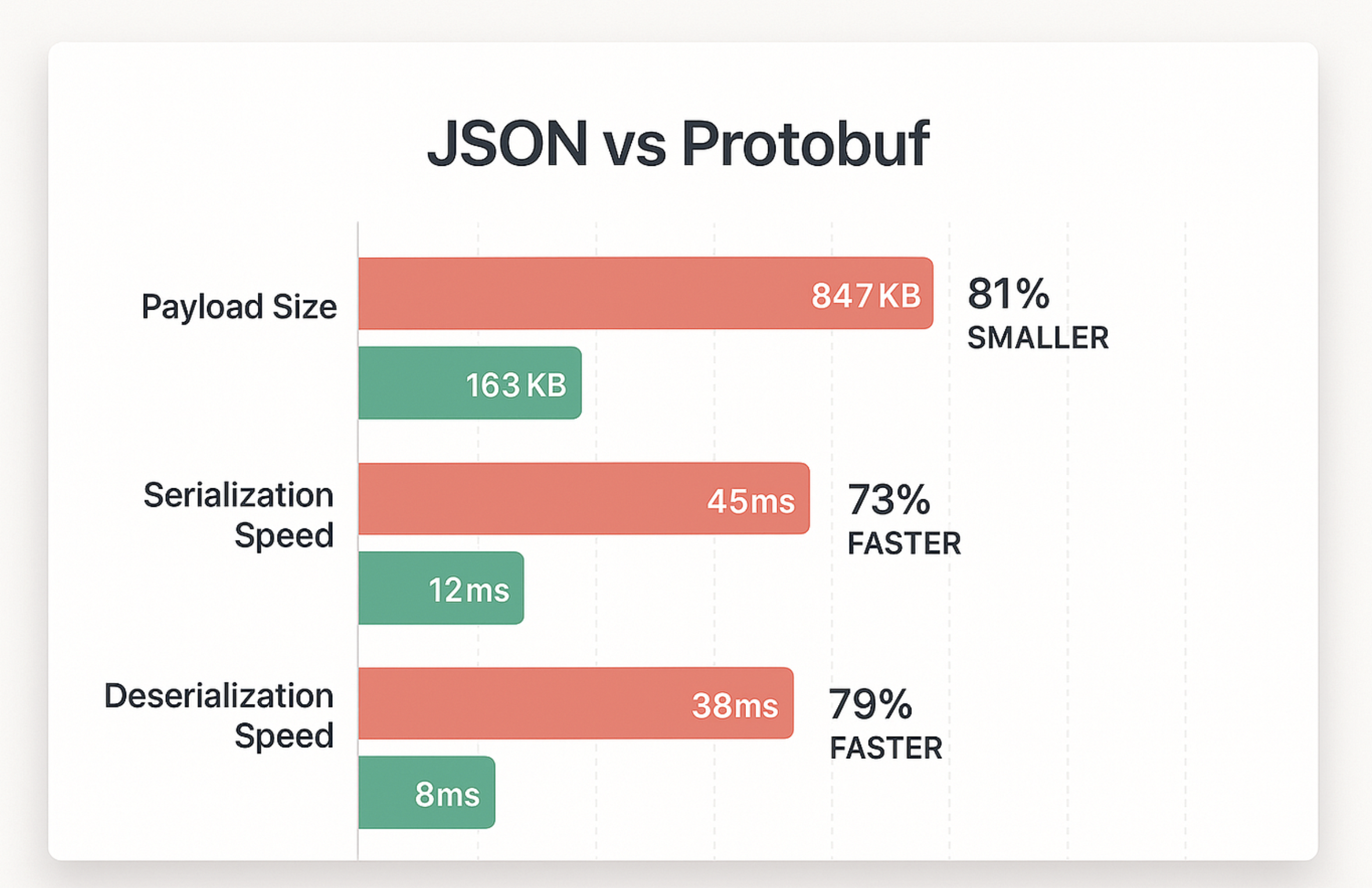 REST와 gRPC의 성능 차이는 단순히 구현체의 문제가 아니라, 기반이 되는 프로토콜과 데이터 전송 방식의 차이에서 비롯됩니다.