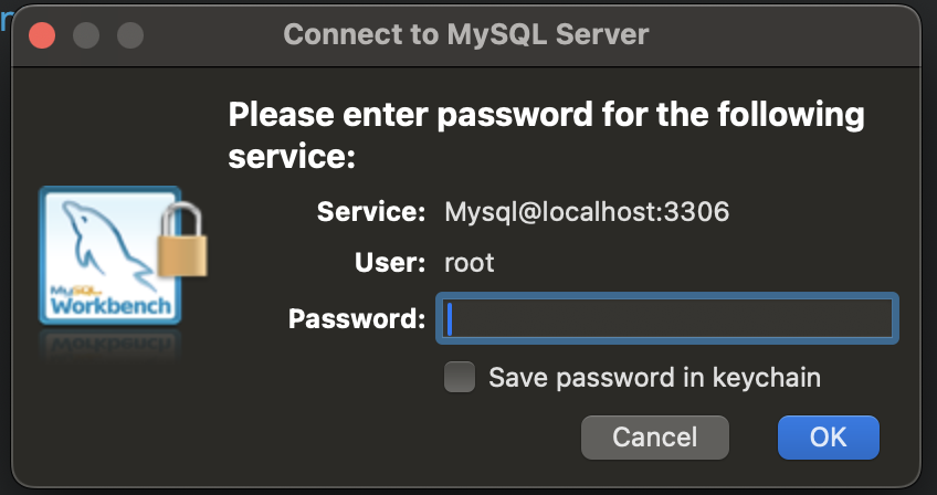 Local instance를 클릭하면 아까 mysql 설정에서 설정해 둔 비밀번호를 입력하는 화면이 뜹니다.