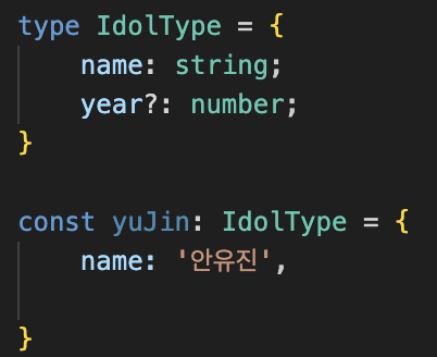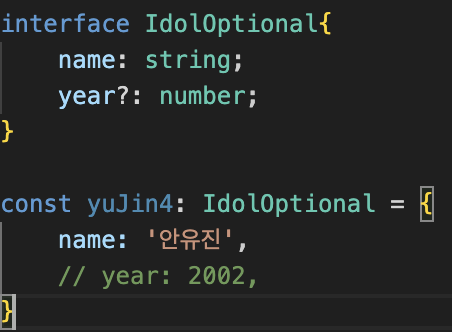 정의한 객체 중에 optional 하게 값을 주고 싶을 때는 아래와 같이 물음표를 변수 옆에 붙여줍니다.