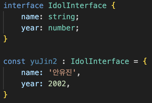 Interface는 object처럼 선언해 주면 사용할 수 있습니다.