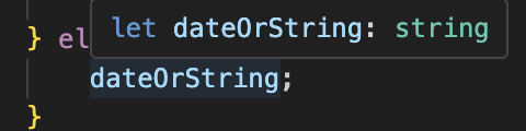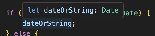 if에는 dateOrString 이 Data 클래스의 instance인지 검사해 줍니다. true가 반환된다면 dateOrString 타입이 Date로 유추되는 것을 확인할 수 있습니다.