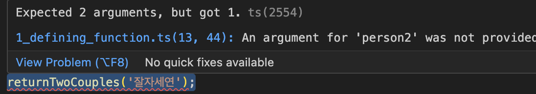 해당 함수가 받아들이는 인자의 개수와 전달된 인자의 개수가 일치하지 않을 때 발생하는 오류가 나타나는 것을 확인할 수 있습니다.