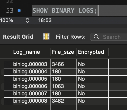 현재 MySQL 서버에서 사용 중인 Binlog 파일 목록을 볼 수 있습니다.