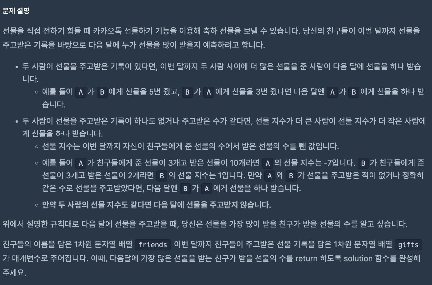 https://school.programmers.co.kr/learn/courses/30/lessons/258712 프로그래머스 코드 중심의 개발자 채용. 스택 기반의 포지션 매칭. 프로그래머스의 개발자 맞춤형 프로필을 등록하고, 나와 기술 궁합이 잘 맞는 기업들을 매칭 받으세요. programmers.co.kr 가장 많이 받은 선물이라는 문제 Java로 풀이하겠습니다. 이 문제는 선물을 주고받은 기록을 토대로 다음 달에 누가 선물을 많이 받을지 예측하는 문제입니다. 규칙은 다음과 같습니다. 두 사람이 선물을 주고받은 기록이 있다면, 이번 달까지 두 사람 사이에 더 많은 선물을 준 사람이 다음 달에 선물을 하나 받습니다. 두 사람이 선물을 주고받은 기록이 없거나 주고받은 선물의 수가 같다면, 선물 지수가..