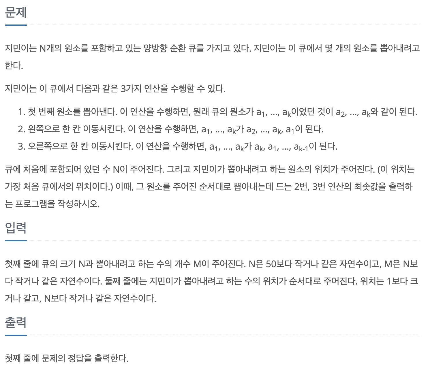 https://www.acmicpc.net/problem/1021 1021번: 회전하는 큐 첫째 줄에 큐의 크기 N과 뽑아내려고 하는 수의 개수 M이 주어진다. N은 50보다 작거나 같은 자연수이고, M은 N보다 작거나 같은 자연수이다. 둘째 줄에는 지민이가 뽑아내려고 하는 수의 위치가 www.acmicpc.net 회전하는 큐 문제 Java로 풀이하겠습니다. 이 문제는 큐에서 원소를 뽑아내는 연산을 최소화하기 위해 어떻게 큐의 상태를 조작해야 하는지를 찾는 문제로 보입니다. 다음과 같은 알고리즘으로 문제를 해결할 수 있습니다. 큐의 첫 번째 원소를 뽑아내는 연산을 수행합니다. 원하는 위치에 도달할 때까지 큐를 왼쪽으로 이동하며 연산을 수행합니다. 이때, 왼쪽 이동 연산 횟수가 원하는 위치에 도달하기 위한..